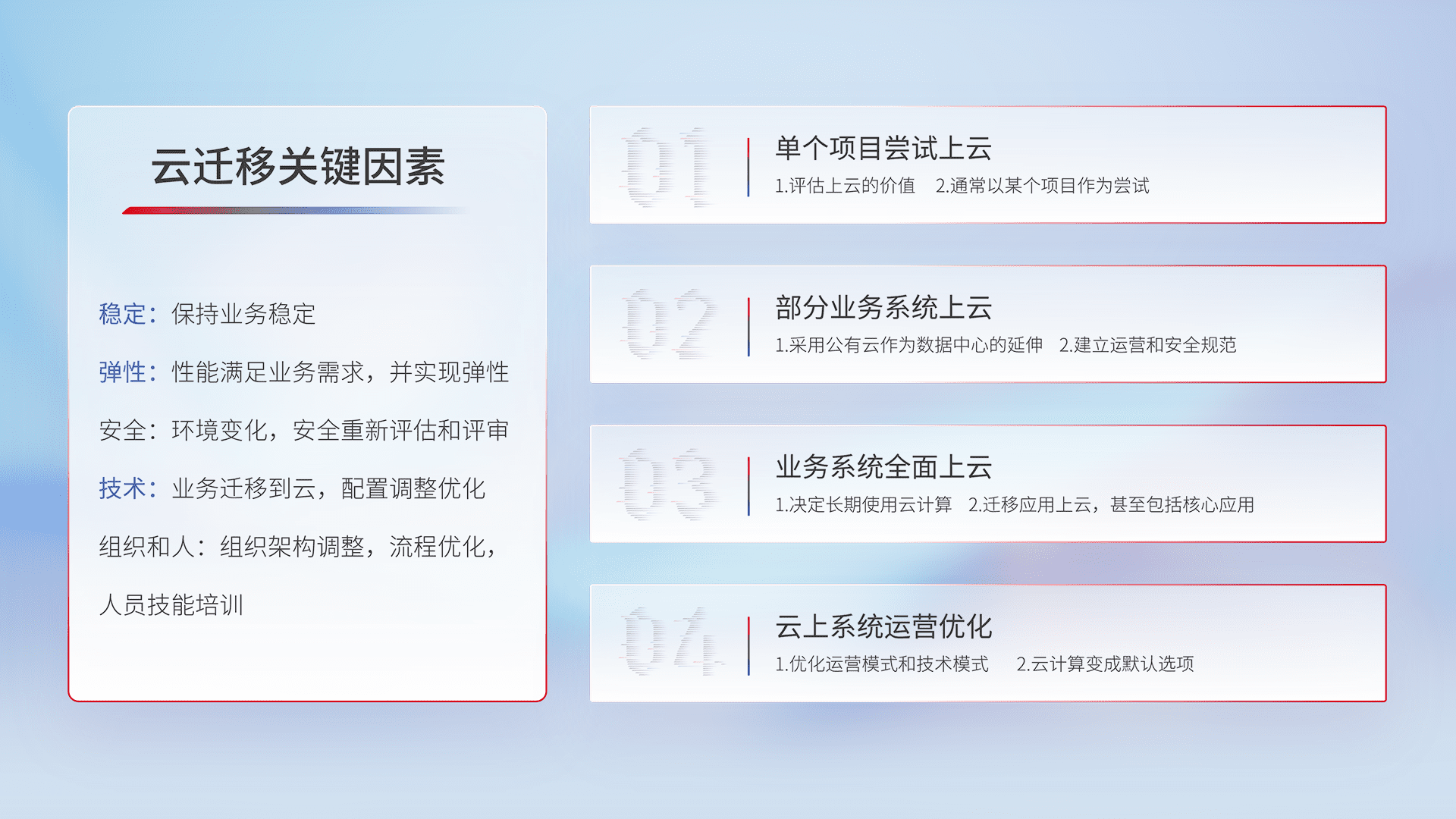 结合实际业务,,,从规划设计、、、云平台选型、、、、云原生改造、、数据迁移、、集成交付,,,,迁移全过程为客户识别最佳上云路径,,做好风险识别管理,,设计网络架构、、、、身份权限、、、、安全审计合规、、、、操作审计、、日志审计、、监控告警策略、、、多站点容灾设计等,,,对云上基础设施进行整体规划,,,,提升IT治理水平,,,,以满足弹性、、、、高可用、、、、高性能的需求。。