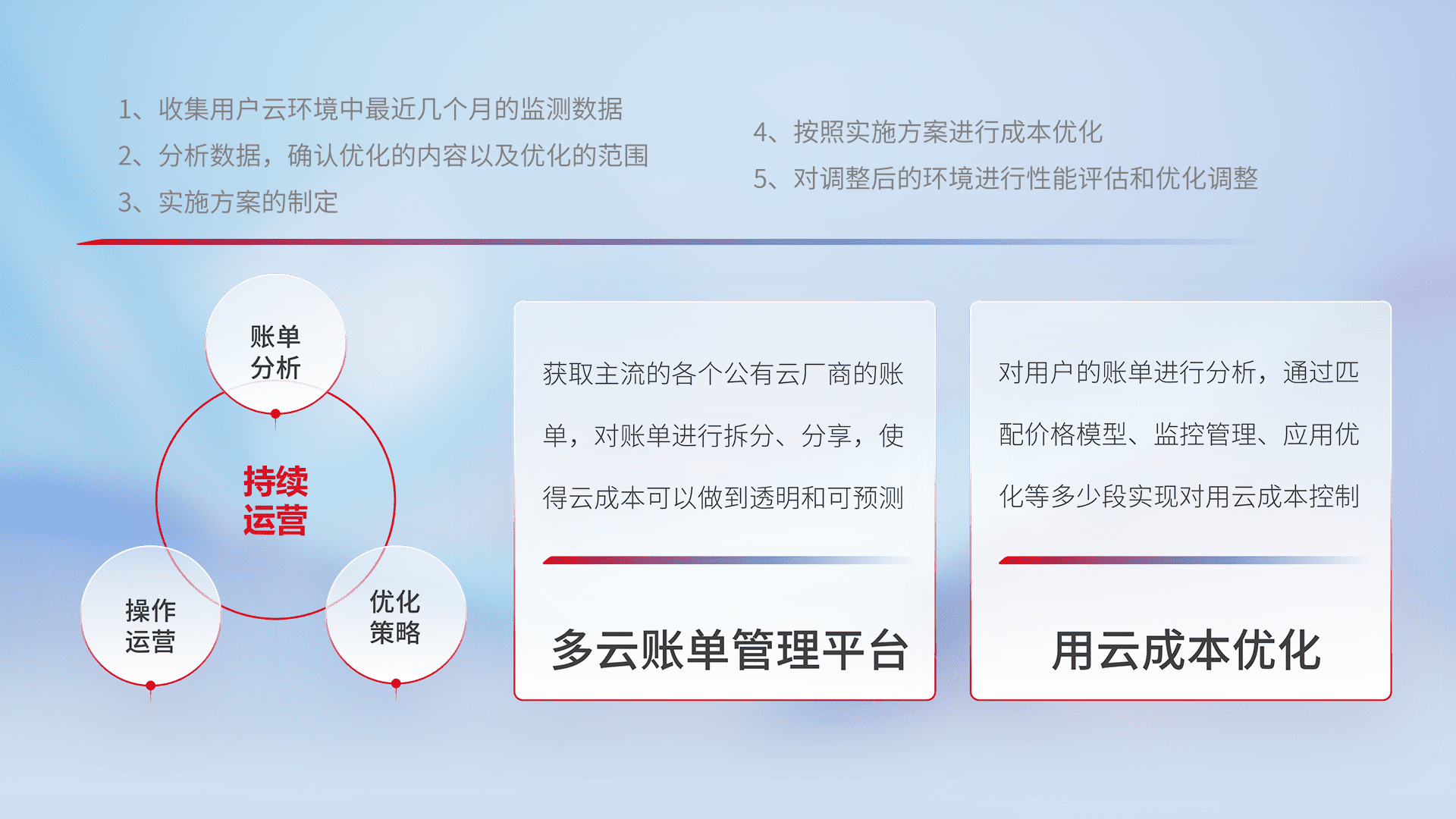 通过多云纳管,,以统一的资源数据模型把客户的云资源进行抽象和封装,,,,进而实现对多云资源的统一操作,,,保障云资源管理的可靠性、、、稳定性与可用性。。。量身定制化运维内容,,,配置、、、开发运维、、、补丁管理、、、、备份、、、监控、、、认证和访问管理、、审计和日常巡检等,,保障在用云过程中的可靠度,,稳定度以及高可用率。。。